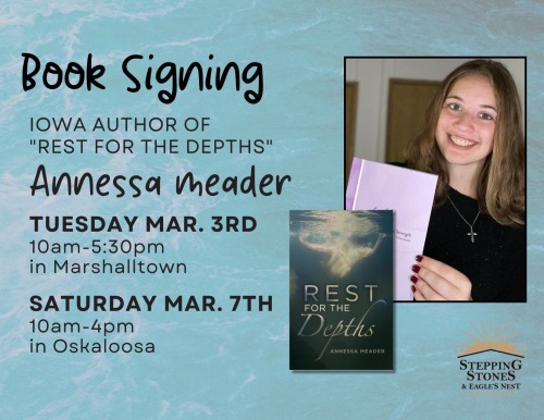 Annessa Meader, Author of "Rest For the Depths", will be visiting STEPPING STONES & EAGLE'S NEST CHRISTIAN BOOKSTORES at our 14 West Main Street Marshalltown location on Tuesday, March 3rd from 10 am-5:30 pm and at 117 S Market Street Oskaloosa on Friday, March 7th from 10 am - 4 pm